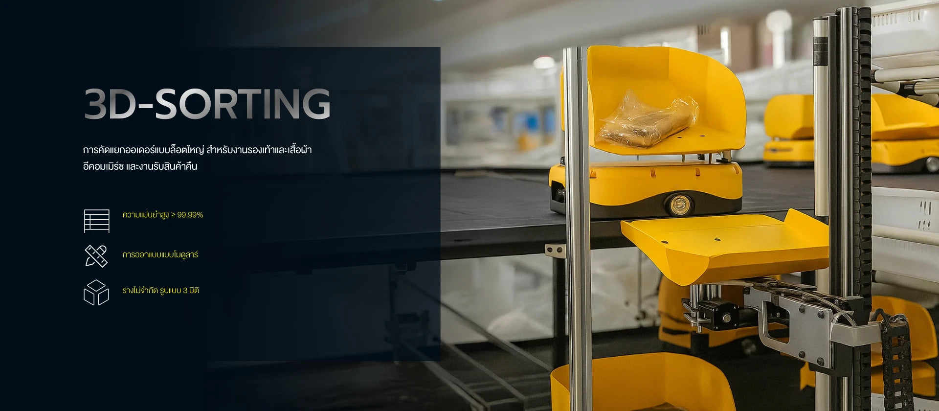 คือระบบคัดแยกอัตโนมัติที่ใช้หุ่นยนต์เคลื่อนย้ายพัสดุในแนวราบและแนวดิ่ง (3D) เพื่อส่งไปยังปลายทางได้อย่างแม่นยำและรวดเร็ว เหมาะกับศูนย์กระจายสินค้าหรือคลังอีคอมเมิร์ซที่มีปริมาณพัสดุมาก