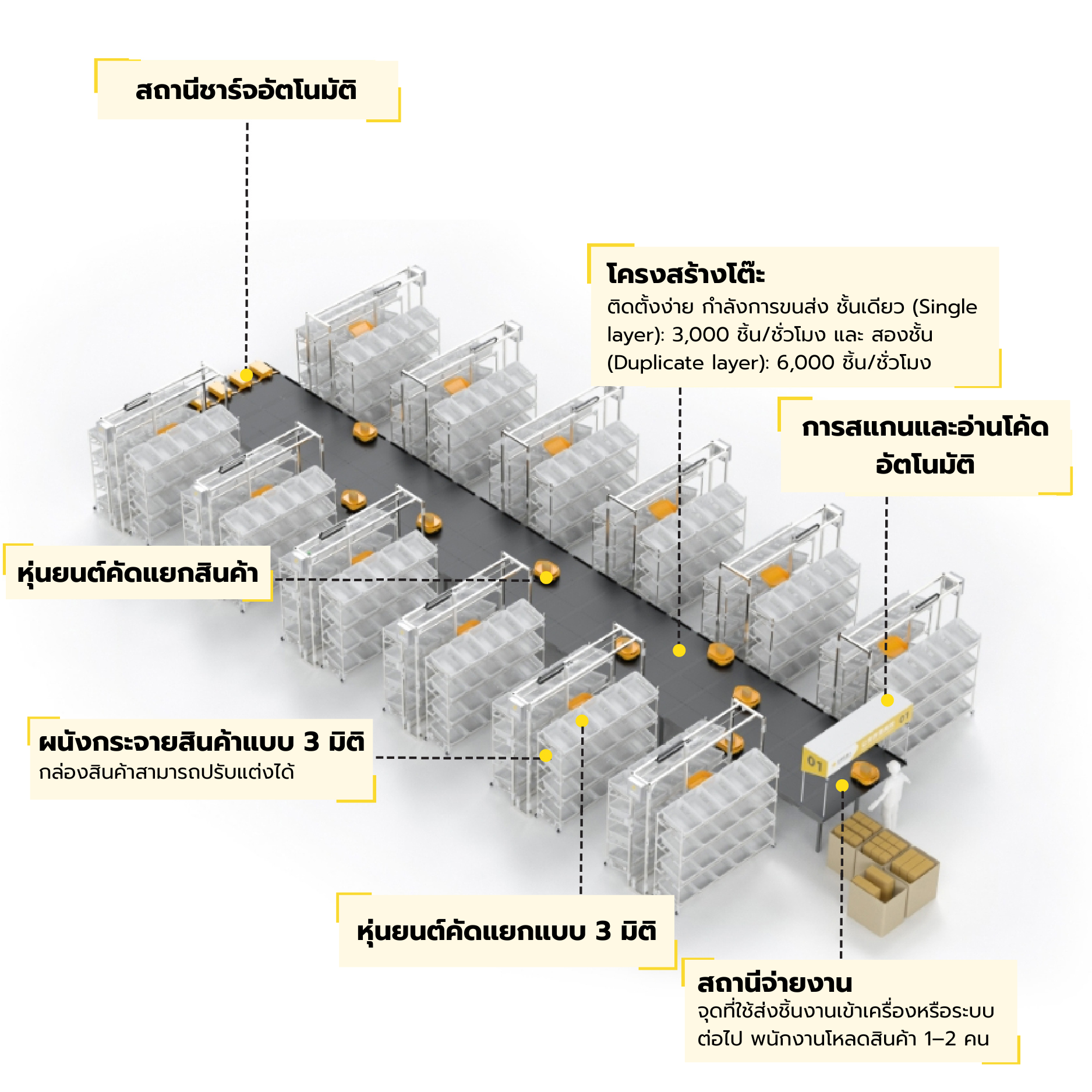 ระบบคัดแยกสินค้าแบบหลายมิติ ช่วยส่งพัสดุไปยังปลายทางจำนวนมากในพื้นที่จำกัด และรองรับการคัดแยกได้หลายชั้น/หลายเลนพร้อมกัน