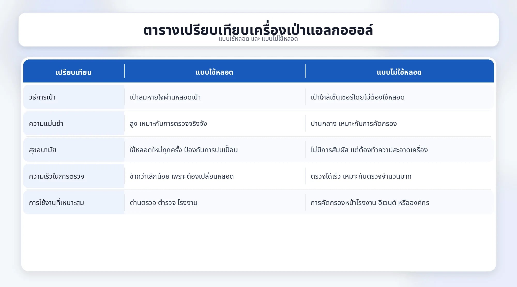 เครื่องเป่าแอลกอฮอล์แบบใช้หลอดจะให้ความแม่นยำสูงและใช้หลอดเป่าแบบใช้ครั้งเดียวเพื่อความสะอาด เหมาะกับการตรวจรายบุคคล ส่วนเครื่องเป่าแอลกอฮอล์แบบไม่ใช้หลอดจะตรวจได้รวดเร็วและสะดวก เหมาะสำหรับการคัดกรองคนจำนวนมากในเวลาอันสั้น