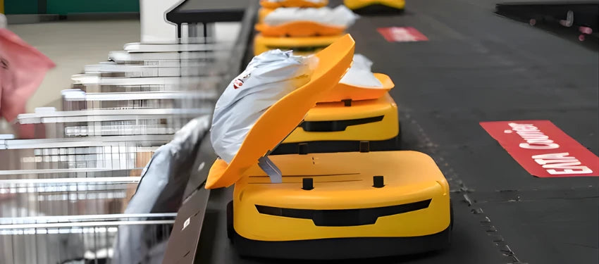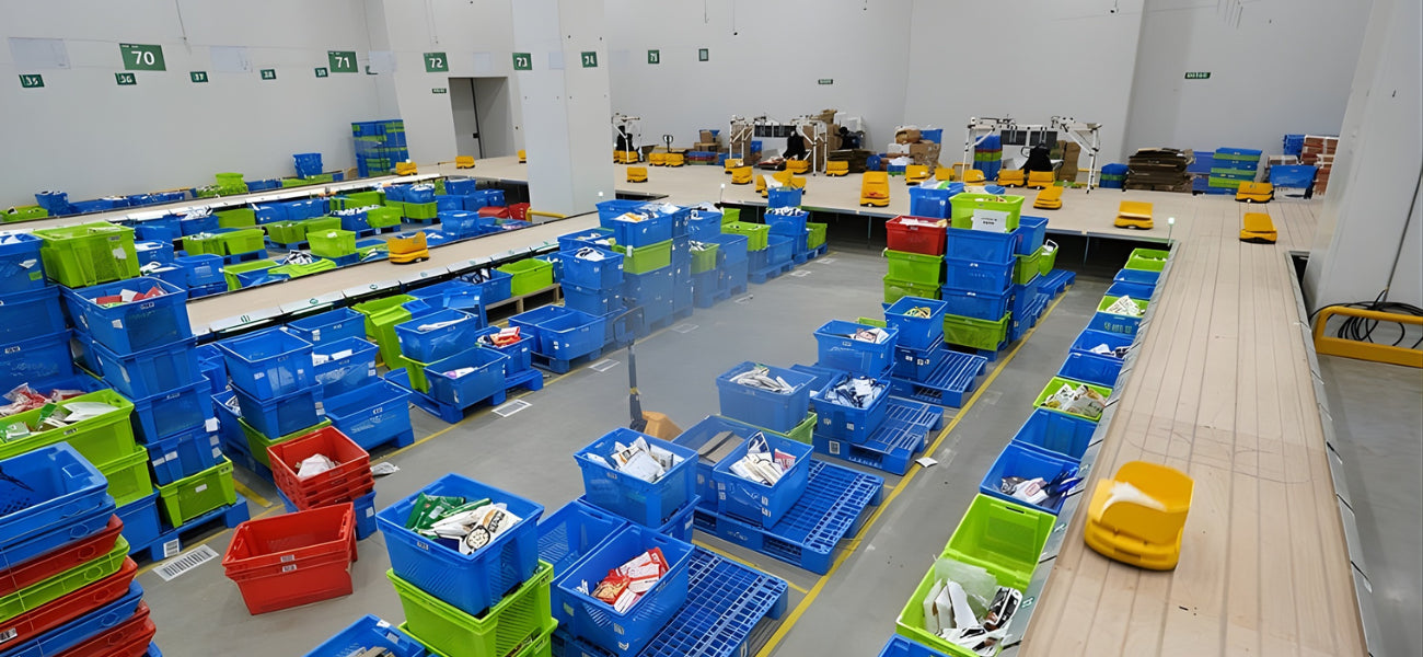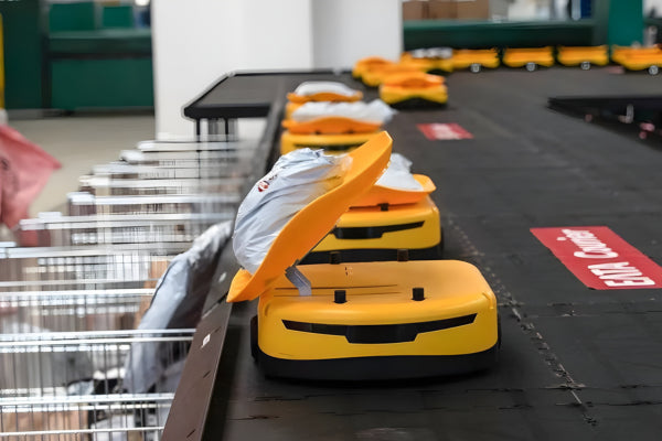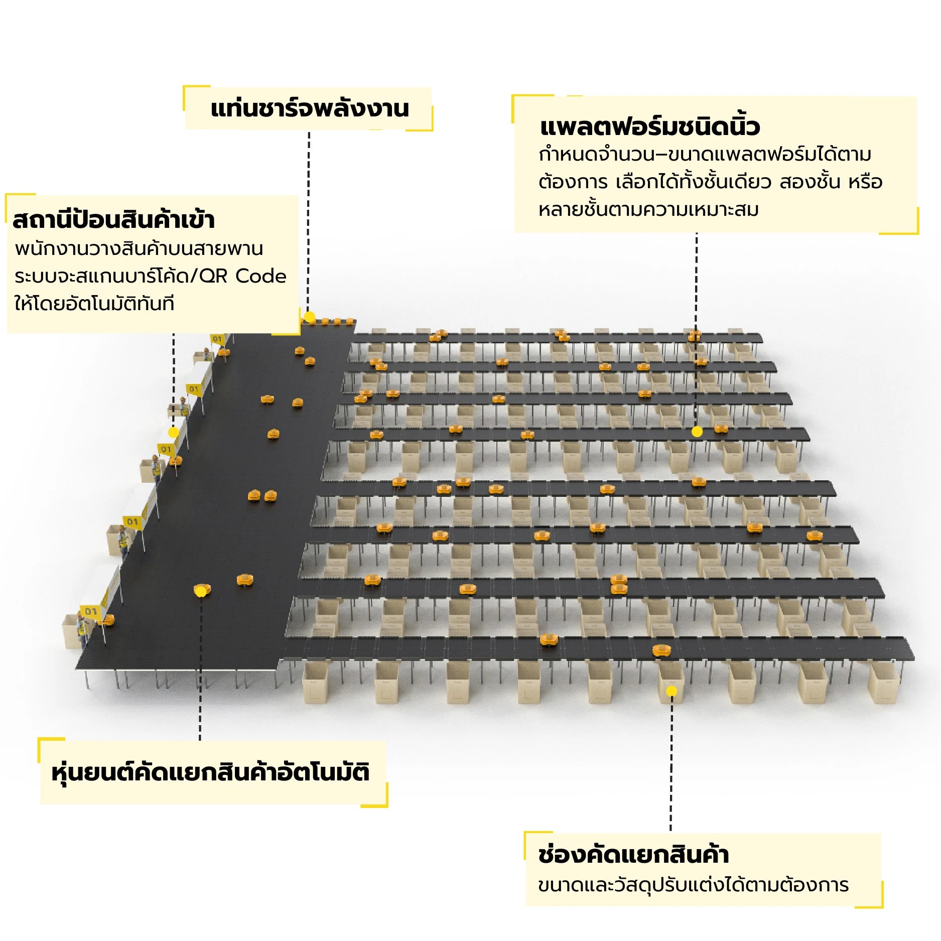 ระบบคัดแยกพัสดุอัตโนมัติที่ใช้ รถหุ่นยนต์วิ่งบนราง แทนสายพานยาว รับ–ส่งพัสดุจากจุดรับไปยังปลายทางได้อย่างยืดหยุ่น รวดเร็ว และปรับเส้นทางได้ง่าย